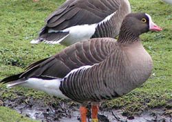 Пискулька Пискулька - Anser erythropus см. также 6.1.2. Род Гуси — Anser Пискулька [73] - Anser erythropus Очень похожа на белолобого гуся, но еще мельче, темнее, клюв короткий; у взрослых белое пятно на лбу заходит на темя, а вокруг глаз узкое желтое кольцо. В полете кажется более острокрылой. Гнездится на озерах или среди камней и скал в тундре и лесотундре, чаще у края леса, на пролете встречается по всей территории. Голос очень высокий и визгливый. В последние годы стала редкой и занесена в Красную книгу России. К сожалению, лишь немногие охотники способны отличить пискульку от белолобого гуся, и ее продолжают отстреливать во время пролета. |