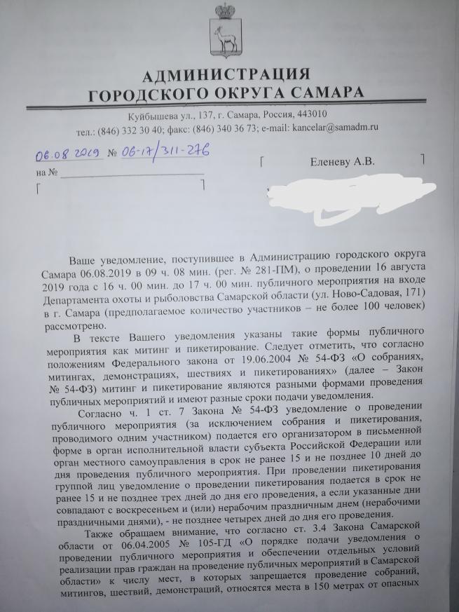 Через 2 часа с момента отправки пресс-релиза по СМИ Самарской области, а также по группам в вк посвященным охоте в Самарской области мне позвонили из Администрации г.о. Самара касательно уведомления о пикете 16 августа.