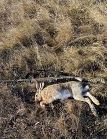 Решил перейти "зеленку" и проверить еще одно очень красивое место, где на закрытии прошлого сезона поднял несколько зайцев, но не добыл. Опять зачелночил и не заметил ни подъема зайца, ни его самого, но лежку в кусте ковыля нашел, так как всегда проверяю возможные места лежек. Стал проверять все вокруг. Облазил все возможные места, где он мог опять лечь, но все пусто. Вернулся к лежке, и от нее пошел прямо в направлении, куда мог побежать заяц от меня. Вышел на узкое травяное место(метра 4) между "зеленкой". Сделал несколько шагов и впереди слева подъем. Заяц выскочил на " заленку" и понесся вперед. Первый выстрел "3" БК точно в голову. Вес 4100.