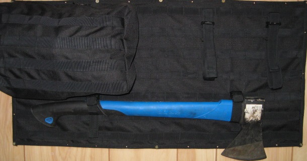 Данная платформа, с большим подсумком размер ДхВхГ 32х20х10 см. и + Подсумок малый для фиксации топора ДхВхГ 15х10х2 см. (на фото его нет) + 4 стропы с пряжкой и заклепкой для фиксации различных мелочей. Будет стоить 5000 рубликов.