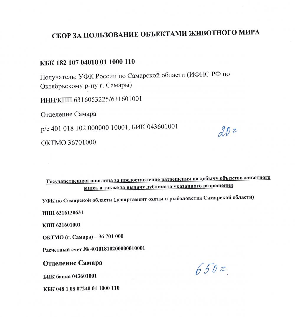 Это реквизиты куда платится: - гос пошлина за разрешение - 650р. - сбор за пользование объектами животного мира (например кабан или косуля сейчас 450р. , фазан - 20р., лось - 1500р.) Если в ГУ у вас был не заполнен ИНН, то необходимо этот номер назвать Нине Ивановне. |