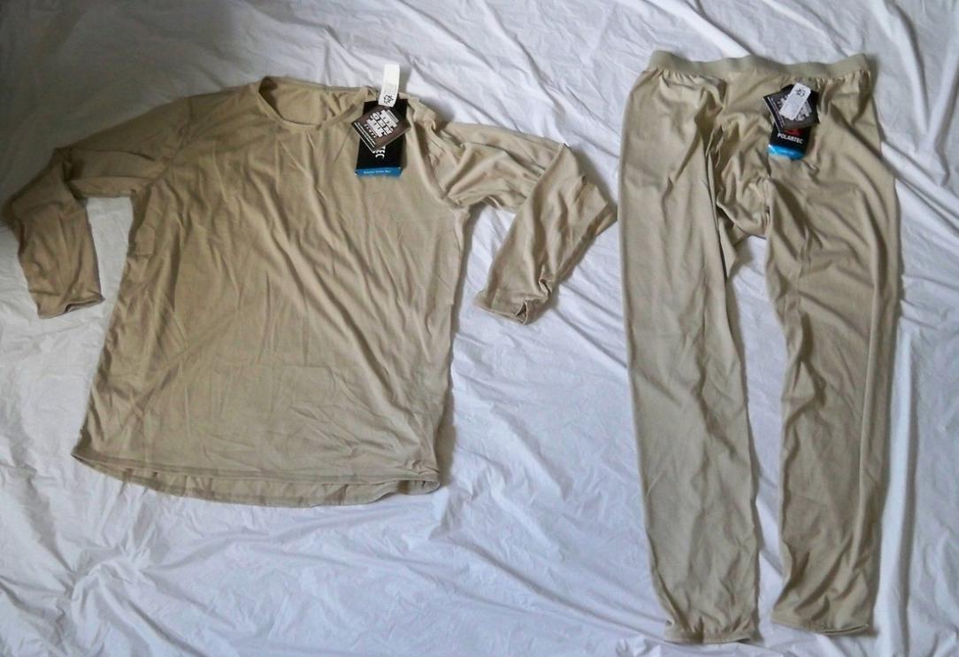 Слой 1. Представляет из себя комплект футболки с длинным рукавом и кальсон, цвет десерт санд. Задача этого слоя состоит только в отведении пота на следующие слои, таким образом этот слой не согревающий а только потоотводящий. Комплект выполнен из PolartecR Power DryR. Размер комплекта таким образом подбирается так чтобы был максимально обтягивающим. Вырез на футболке О образный, на рукавах имеются отверстия для больших пальцев рук. По тактильным ощущения материал очень приятный к телу, напоминает шелк. При примерки и фотографировании при температуре окружающего воздуха в 25 градусов по ощущениям в 1ом слое прохладнее чем без него. Вес 320 грамм