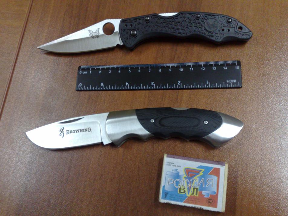 Сам пока владею: Виксом офицерским (живет в планшетке) златоустовский "Турист". Сталь 95х18 (ходит со мной на охоту) Бэнчмэйд Пика II. Сталь 9Сr13 (карманный). Очень понравился Колд Стил Ультимэйт Хантер, будем искать... Крайняя посылка с кабеласа. Браунинг, к сожалению, не мой(((