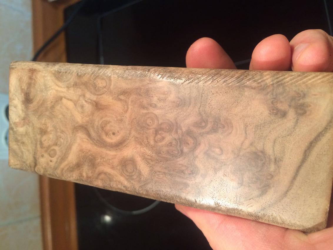 Корнекап ореха вроде. Тяжёлый в обработке на красивый зараза) один из ножей собирал с такого куска. После полировки глубокий
