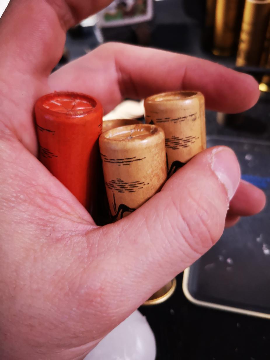 В голову пришла мысль использовать малярный скотч, а точнее я ее уже реализовал. Маток скотча разрезал, получилась полоска. Пыжерезом высек три пыжа для пробы, далее начал наклеивать "наклейки" на донце гильзы и затем все это дело промаркировал шариковой ручкой. Получилось не плохо.