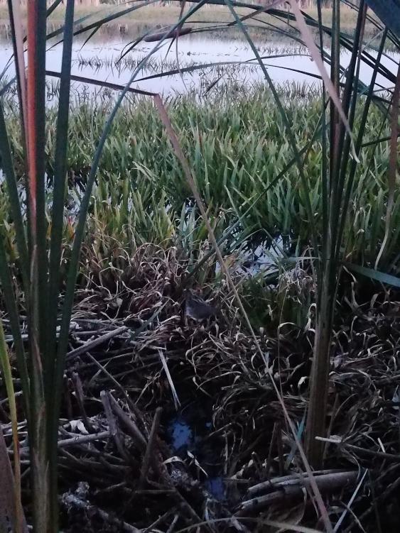 Ну я и не уверен кто это. За спиной поле подсолнуха, а это озерцо, которое в этом году значительно обмелело. Густой камыш. Они попискивали постоянно в камыше, а эта слева на право от меня прошлась передо мной. На тоненьких длинных лапах. Думаю, что птенец еще. На водопой пришел.