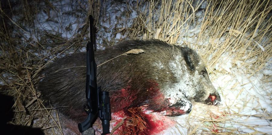 Шорох… Да нет, это ветер… Шорох… Бл..ь кабан наш ведь. Предохранитель выключил, теплик и не гасил…Не видно ни чего. Видимость с фонарем метров 5, с тепликом максимум 7. Медленно идет на меня, все – вижу… По инерции крутнул башкой влево в право, кабан дернулся влево, хвост дыбом, холка стоит, практически не раздумывая выстрелил… Затих!