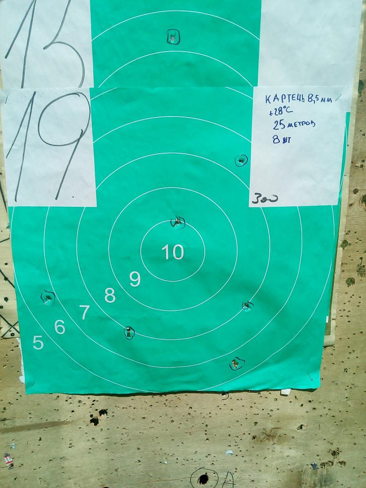 Очень приличная кучность. Но я насчитал 9 отверстий, а не 8. Как укладывали картечины, как фиксировали? Какое дульное сужение?