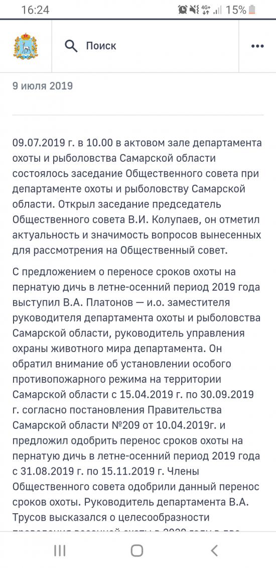 — водоплавающей, болотно-луговой, полевой и степной дичи в период охоты с 17 августа по 15 ноября 2019 года;