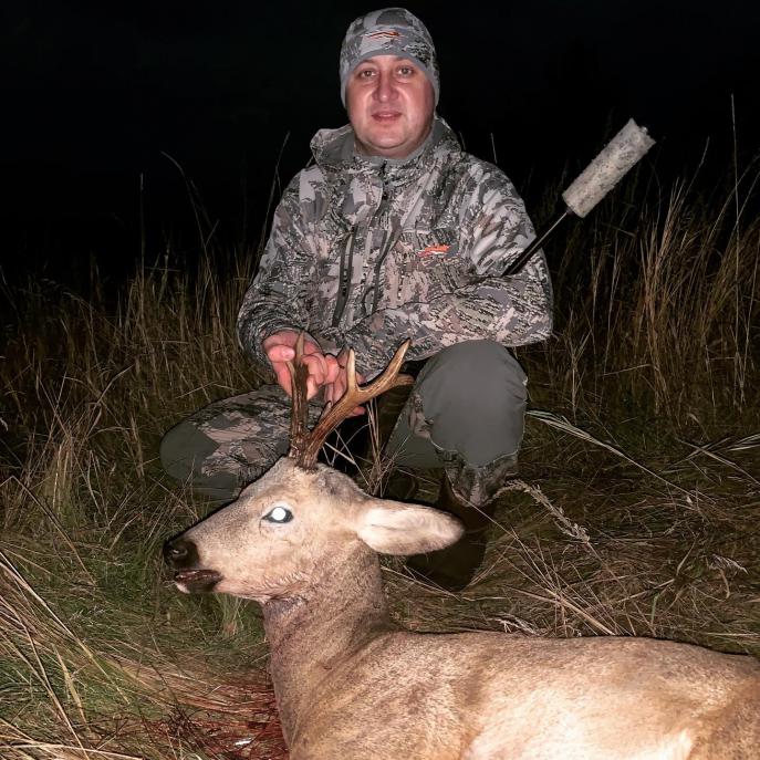 Кромешная темнота упала рано, еще 19-30. Козы, сеголетки… Кабанов нет достойных, нет и хорошего козлика. Скукотень. Дождик еще начался… Пристрелка показала идеальный результат от чего вера в предстоящий положительный результат и надежда на знатный трофей, не оставляли. И как часто бывает, уже двинулись тихонько к машине, пора домой, надышались свежим воздухом, насмотрелись на наш «зоопарк», из посадки выглянула голова… Голова с рогами… Тренога, прицел, быстро вложился. Козел не торопился. Не торопится, осматривается, идет поздно, значит наш клиент… 150 метров. Нечего раздумывать, по шее видно, экземпляр хороший, по шее и будем стрелять. БАХ! И ничего не подозревающий зверь закрутил ногами «велосипед»… «С полем!» |