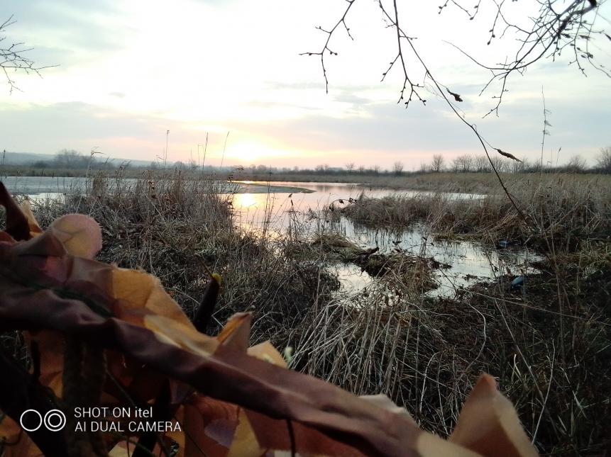 Сергиевский район, воды ещё практически нет, реки и озера во льду, только лужи на дорогах. Решили просто посидеть выкупать утку в луже, но, пока утка купалась, удалось под вечер наманить и открыть сезон