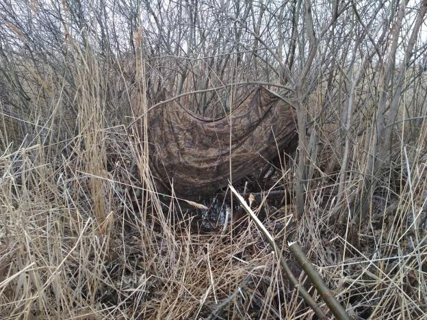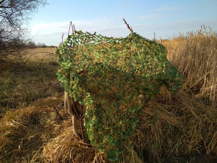 лучше конечно маскировку соответсвующей по расцветке окружающей растительности, но если под рукой больше ничего не было, то достаточно было пяток пучков травы или камыша на зеленую сетку кинуть, чтобы размыть контур и все...