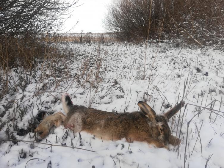 Всю ночь не прекращался снег, уже 8:00 а он все подсыпает. В надежде на тихие местечки отправляюсь на разведку. Первый след на полевой дороге, но капитально задут. Поставил галочку, куда вернуться в хорошую погоду. Второй шанс выпал возле лесного колока, немного потропив, бросил и этот следок с пониманием безнадежности мероприятия без напарника. И снова в путь! К третьему ушастику, не ожиданно, подкатил на машине и остановился в метре от лежки. Подумал что уже его там нет, вышел поглазеть, а он выскочил прямо у меня под носом, чуть не сшиб с ног! Ружье в чехле и не заряжено лежит в машине.... Осталось только свистнуть ему в след и рассмеяться от души, наблюдая его петляющего по пригоркам! Утро воскресения выдалось солнечным и безветренным. Напарник снова не смог ко мне присоединиться. Отправился один. И сразу же свежий следок! Место просто роскошное! Поле подсолнечника граничащее с озимками, а через "асфальт" некошеный луг с высокой травой и мелким кустарником. Жировал косой и на озимках, и на подсолнечнике. Три раза меня через дорогу асфальтированную водил в некошеный луг, каждый раз адреналиновый впрыск в ожидание подъема из под ближайшего кусточка! И вот уже четвертый переход и долгожданный подъем! Прицелиться хорошенько не позволяет короткая дистанция, а отпустить дальше ближайшие заросли ветлы! Вскинул ИЖ, закрыл стволами беглеца и дуплет!