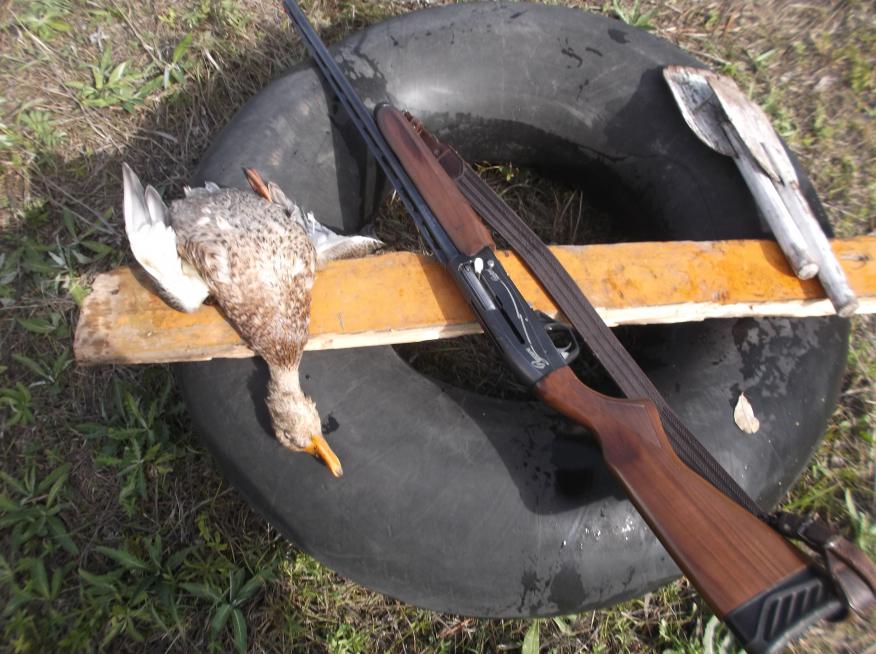 Обошёл с утра все свои знакомые лужи. Везде тишина. Думал , что без выстрела останусь. Но осталось ещё две не проверенные баклуши. И вот подходя к предпоследней поднимаю красивого селезня с зелёной конкретно головой. Но я оказался за высоким кустом ивняка. Пока оббежал, селезень был уже не на выстрел. Стою ругаю себя ,что не зашёл с другой стороны. А в кармане лежит утиный возбудитель ( увесистая щебёнка), решаю кинуть её через кусты . Кидаю -и о чудо, с того же места откуда взлетел селезень вдруг взлетают три кряквы и летят от меня. Выбираю ту что посередине и первым выстрелом сбиваю. Феттер№3 ( 7 просто закончилась , а купить некогда). Утка падает прямо на границу воды и берега. Бегу к ней ,а она вдруг сигает в воду и давай уплывать. Ещё выстрел и утя успокоилась. Доставать пришлось с помощью баллона. Достал и домой- мне хватит.