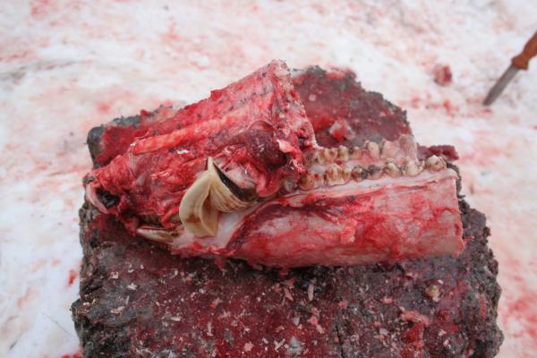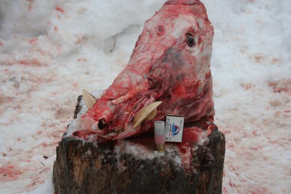 дырочка во лбу от пульки патрона 7,62*53 , которая никак не хочет рикошетить от лобовой кости, вопреки широко распространённому мифу об особой прочности лба у кабана. правильно отрезанные клыки должны выглядеть вот так: никакой рубки топором, только пила ручная по металлу или бензопила... |