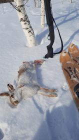 Подходу-зайченок, мелкий еще совсем. Собака его прижала и держит. Так что взяли живьем. Отпущен восвояси, но думаю что не выживет он. Если уж собака его поймала, то лисы точно сожрут. |
