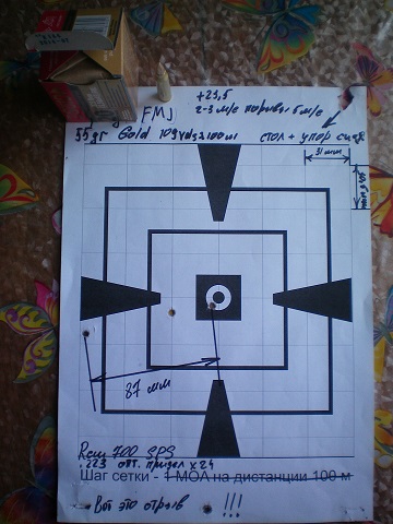 По цене, отечественные патроны удалось купить от 10 до 15 рублей. И так, входные данные - Remington .223 SPS без глобальных вмешательств в конструкцию, как говорится с коробки. Китайский прицел "нонейм" 6-24x50 Стрелок - не фонтан Вечер, хорошая погода, солнечно Девять чистых мишеней Куций, шатающийся стол, два балона вместо стула, упор в виде бруса 100х150 покрытый плотным покрывалом. Дистанция 100 метров Результаты: Для начала относительная новая линейка патронов Barnaul Gold Внизу мишени дикий отрыв, даже выстрел показался каким то странным, как будто пороха не доложили :) Барнаул FMJ 62gr Барнаул HP 55gr |