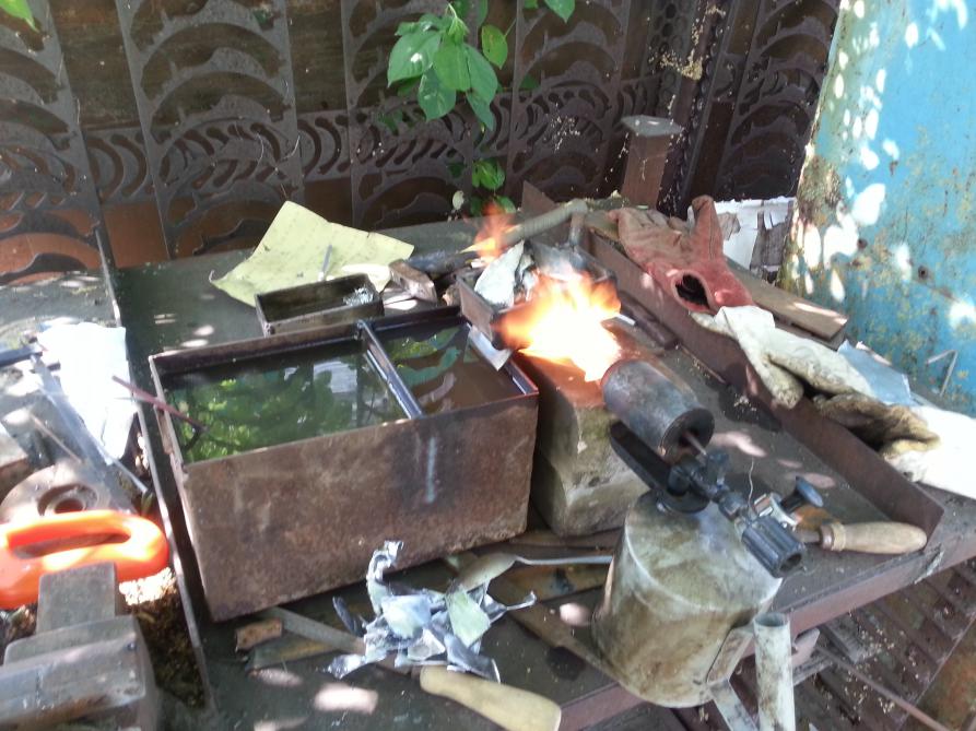 Сегодня на даче сварил две дроболейки. Взял два куска швеллера см по 20, к передней и задней части приварил полосу. В одном просверлил отверстие сначала сверлом 6мм, процентов на 80, далее сверлом 0,5мм. В другом швеллере 3 отверстия тоже сначала 6мм а потом 0,7мм. В качестве ската использовал кусок уголка, его наглухо приварил снизу швеллера, чтобы он был той же температуры что и вся дроболейка, ну и зачистил его болгаркой. Расстояние от дырок до ската 0,8 мм, длина первого ската примерно 2,5 см, второго 1,8. Ну и сварил бадью разделенную под вода/масло. Масло использовал трансформаторное.