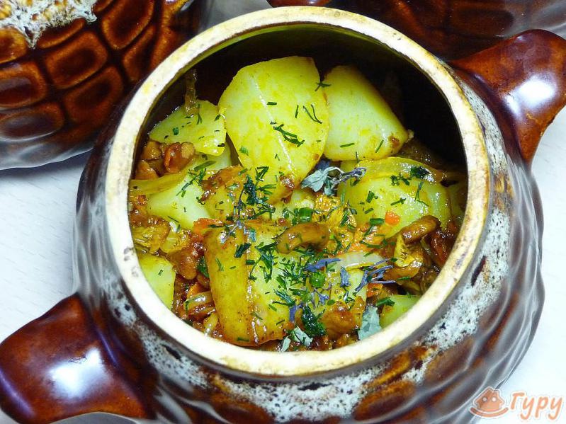 Ингредиенты: 1 цыпленок (200 г), 140 г картофеля, 50 г репчатого лука, 25 г моркови, 10 г кулинарного жира, 5 г сушеных белых грибов, соль, 10 г сыра, зелень петрушки. Для соуса: 75 г сметаны, 10 г муки, 75 г грибного отвара, соль. Приготовление: Обработанного цыпленка разрубить на куски массой 40-50 г. Сырые картофель, морковь, лук порезать кубиками. Лук и морковь спассеровать отдельно друг от друга. Подготовленные грибы отварить, нарезать соломкой. Куски цыплят положить в горшочек, добавить сырой картофель, пассерованные лук и морковь, грибы, залить сметанным соусом и тушить в духовке 30-40 минут. За 10-15 минут до окончания тушения посыпать тертым сыром. Для соуса муку спассеровать без жира, слегка охладить, влить горячий грибной бульон, вымешать до однородной массы, варить 20 минут. В конце варки добавить прокипяченную сметану, соль, варить еще 5 минут, процедить. Подать, посыпав зеленью петрушки.