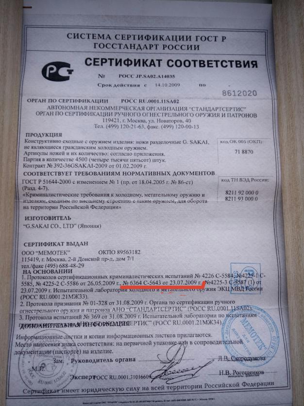 Продам коллекционный нож, полочник G.Sakai, Bosen Enkuto S.P Сталь SLD (SKD-11 / Laminated SUS-405) 3 слоя. Твёрдость 63. Общая длина 33,5. Длина клинка 21,5. Толщина обуха 5. Сечение клинка - Convex Grind. Материал рукояти - бук. Ножны: дерево чёрный бук, латунь, кожа. Коробка и сертификат в наличии. С производства снят. В интернет магазинах в продаже есть только укороченные версии с длиной клинка 16,5 см., цена на них колеблется от 14000 - 27000 рублей: