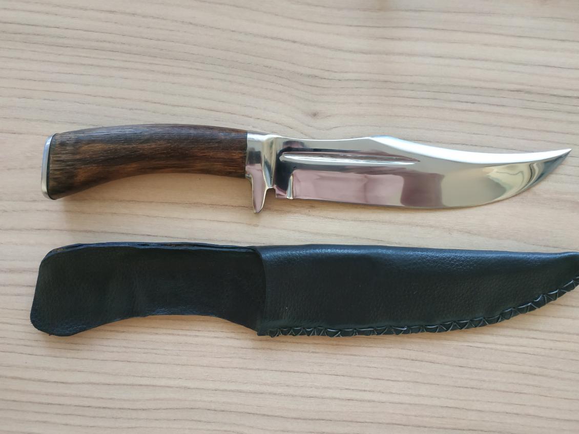 Продан.Нож изготовлен из тепловозного клапана.Следы ковки присутствуют.Общая длина 30 см,длина клинка 18 см,толщина в обухе 5мм.Монтаж сквозной.Сталь лютая,хоть по костям,хоть по гвоздям.В комплекте кожанные ножны.Цена 2900р.т.8902375ноль ноль 91