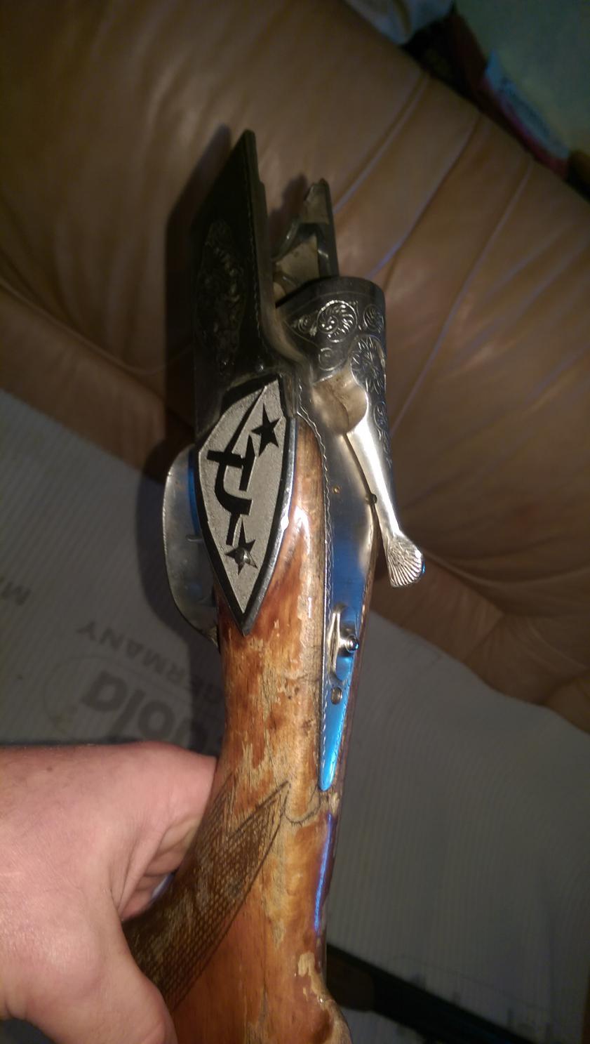 Мой хороший знакомый решил прекратить занятия охотой по причине возраста и состояния здоровья. Попросил меня разместить информацию о продаже ружья на форуме. Итак, продается ружье ТОЗ-34Е штучного сувенирного исполнения, калибр 12Х70, кажется 80-х годов выпуска. В целом ружье находится в рабочем состоянии, но нуждается в углубленном техническом обслуживании (надо почистить и смазать все механизмы ружья), мелком текущем ремонте (замена сломанной пружины экстрактора одного из стволов) и косметическом ремонте деревянных частей (ободрать старый слезший лак, шлифануть и так далее) или их замене по желанию. Стволы в хорошем состоянии, я бы сказал в идеальном за столько лет. Подутий, вмятин нет. Внутри зеркало чистое, никакой коррозии, каверн, сыпи, осыпаний хрома, нет (Да.. умели делать ружья в Туле в советское время). Имеются некоторые дефекты на прицельной планке, последствия установки коллиматорного прицела. Колодка ружья в отличном состоянии, на разгар вокруг бойков нет и намека. Шата стволов тоже нет. По дереву, есть трещина в шейке приклада. Ружье имеет эксклюзивные металлические накладки на щечки приклада с символикой СССР. Изготовлены токарем на заказ и установлены владельцем для усиления приклада после покупки ружья. Ружье приобреталось новым в магазине, за сумашедшие 400 советских рублей.