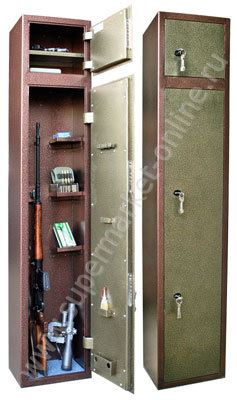Оружейный сейф на 2 ружья. Два отделения. Отделение под патроны запираемое на замок и отделение под ружья. Съемные полки позволяют разместить дополнительную амуницию или в дальнейшем увеличить количество размещаемых стволов. На дне коврик под приклад. Ложементы под цевье выполнены в виде немецких роликовых зажимов, что позволяет четко фиксировать ружья в разных положениях. Особенно с оптическим прицелом. Дверь коробчатая, усилена фальшпанелью и притоплена для обеспечения взломостойкости. Три сувальдных замка "Просам" повышенной секретности. Покраска полимерная-серая шагрень. Сейфы удовлетворяют всем требованиям предъявляемым МВД к хранению оружия. Фото с интернета. В реале 3 полки слева, стволы справа
