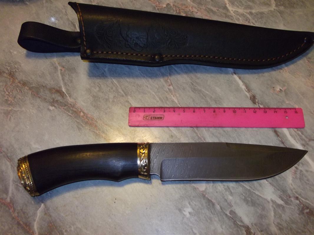 1.Предлагаю вашему вниманию вариант боевого ножа «Каратель» в исполнении без гарды с клинком из кованой углеродистой пружинно- рессорной стали 65Г. Подобные ножи "Каратель" и "Взмах" используются спецподразделениями МВД и ФСБ для работы в тяжелых условиях. Антибликовое покрытие клинка (оксидирование), заточка низ и верхняя передняя часть. Сталь 65Г применяется для изготовления пружин, рессор, корпусов подшипников и обладает достаточно высокой жесткостью и способностью долго сохранять заточку. Исполнение рукояти - комбинация черного граба, гарда латунь. Соединение клинка и рукояти- шпилька диаметром 8 мм до конца рукояти. Этот нож является сделанным вручную высококачественным изделием, которое может украсить любую коллекцию, и может использоваться для охоты, туризма, рыбалки, походов по местам сражений! Made in VORSMA. Не стоит сравнивать этот качественный нож с китайскими «аналогами» из чугуна, покрытыми укрепляющим напылением! Цена пусть-4.500 руб. Характеристики ножа: Сталь пружинно-рессорная 65Г. Общая длина 289 мм Длина клинка 165 мм Ширина клинка 35 мм Толщина клинка 5,8 мм Твердость клинка (HRC) 60-61 ед. Рукоять: латунь, черный граб. Ножны от мастерской "Романа Серкова" 2.Охотничий нож «Шерхан» дамаск. Ручная работа! Черный граб, латунь, герб РФ! Новый охотничий нож «Шерхан» с клинком из кованой дамасской стали.Дамаск имеет великолепные режущие свойства. Рисунок дамаска – «крученый». Кузнец Новоселов. На клинке имеется клеймо. Элементы рукояти выполнены методом литья из латуни, задняя часть - герб России, дерево- черный граб. Соединение клинка и рукояти – шпилька диаметром 8 мм до конца рукояти. Сделано в г. Ворсма, полностью ручная ковка и работа. Ножны из натуральной кожи с тиснением в комплекте.Цена пусть-4.000 руб. Характеристики ножа: Сталь дамасская, пакет ШХ15+ХВГ+У8. Общая длина 270 мм Длина клинка 148 мм Ширина клинка 35 мм Толщина клинка 3,4 мм Твердость клинка (HRC) 59-60 ед. Рукоять: литье латунь, черный граб. Прошу звонить по тел.+семь 927 205 шесть 118 Сергей. Если не беру или сбрасываю-перезвоню сам (не всегда есть возможность разговаривать). Спасибо за понимание. На форуме после 20-00.Но лучше звоните.