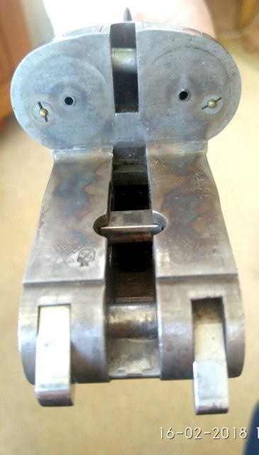 Это Зимсон 235 модели. У этого ружья есть указатели наличия патронов в патроннике. У Зимсона 35 стоят указатели взвода курков, которые находятся внутри колодки, а сами указатели расположены на боках колодки ружья. Цевье у обоих ружей не кнопочное.