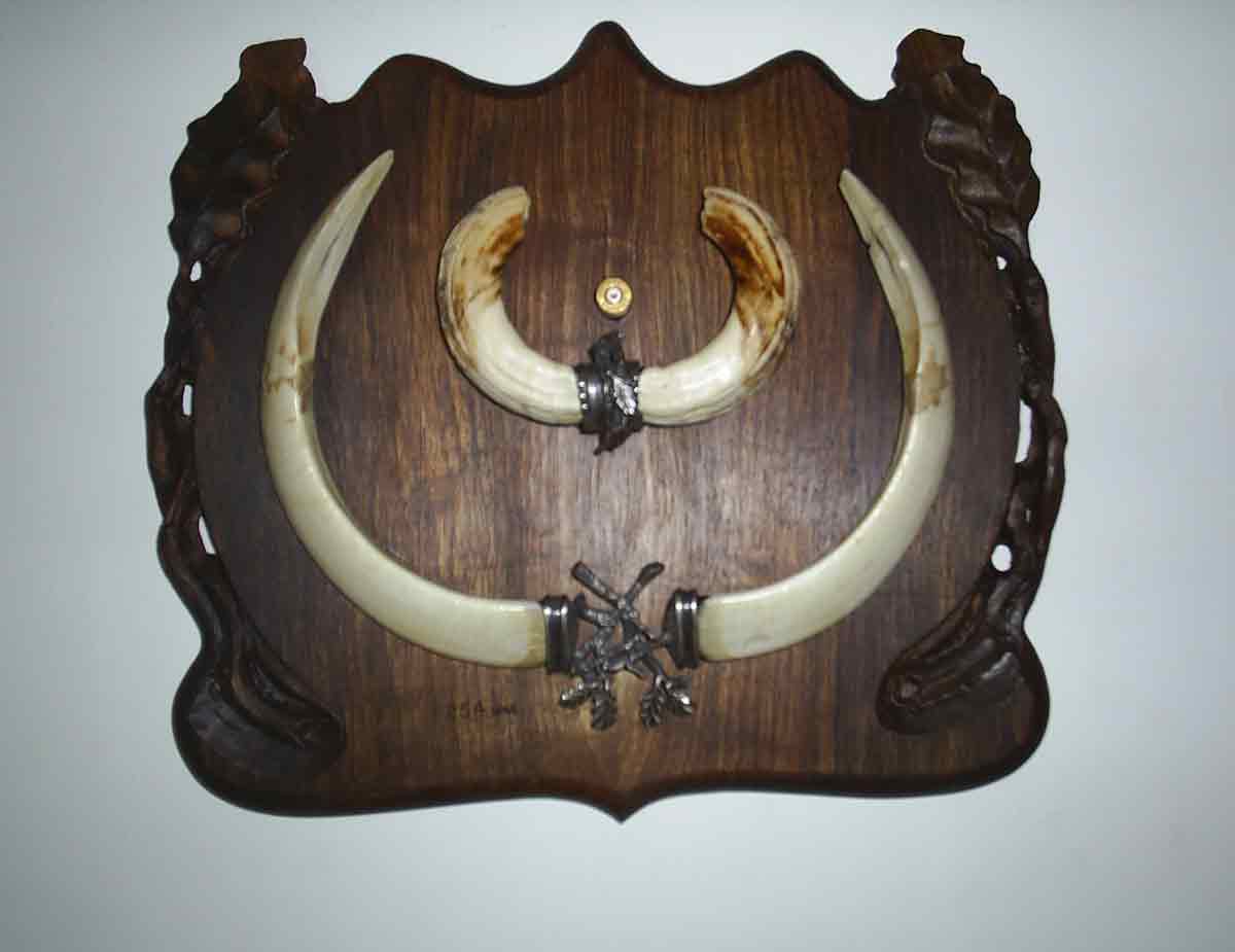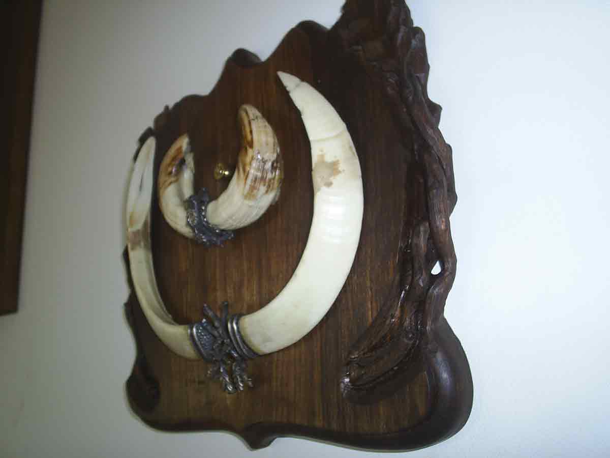 подряд клыки, а для самых крупных и красивых делают медальоны резные из ореха. Резьбой у меня занимается отец, он вырежет любой медальон и посоветует эскиз, цена зависит от сложности. Оформить на простой или резной медальон решать Вам, в любом случае - Это ВАША память об охоте, которую не вернешь.. Кто бывал на охоте в Европе видел оформление замков ((фото Чехия, музей охоты))