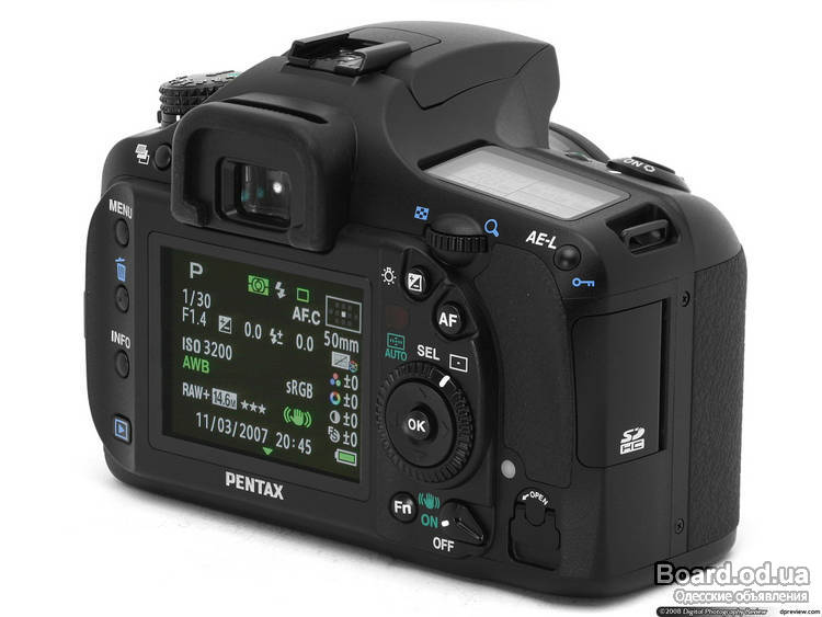 Производитель Pentax Модель К10D Kit + DA 50-200mm Тип поставки в коммерческой упаковке Входит в комплект USB кабель (I-USB17) видео кабель (I-VC28) аксессуар - заглушка • 2 шт. руководство пользователя • 2 шт. крышка объектива аккумулятор (D-LI50) зарядное устройство - зарядное устройство (D-BC50) набор программного обеспечения на компакт-диске (S-SW55) нашейный ремешок (O-ST53) крышка корпуса объектив (SMC Pentax DA 50-200mm) кабель электропитания (D-C02 E) Основные характеристики Тип зеркальный цифровой фотоаппарат для профессионального использования Корпус цвет: черный Тип сенсора ПЗС Размер сенсора 23.5 x 15.7 мм Общее кол-во пикселей оптическое разрешение: 10.75 млн. пикселей эффективное разрешение: 10.2 млн. пикселей Макс. разрешение 3872 х 2592 пикселя Стабилизатор изображения оптический стабилизатор Световая чувствительность ISO 200 ISO 400 ISO 800 ISO 1600 ISO автоматический Соотношение сторон кадра 3:2 Режимы съёмки непрерывно макро по одному кадру Специальные эффекты сепия сжатие чёрно-белое изображение Режимы экспозиции выдержка от руки программный AE режим автоматический приоритет диафрагмы приоритет затвора программный ручной Замер экспозиции 16 зон замера экспозиции методы замера: · центрально-взвешенный · мультисегментный · точечный Компенсация экспозиции в диапазоне ±2 уровня, с шагом 1/3 EV Выдержка 1/4000с - 30с Автофокус TTL, 11 точек фокусировки Баланс белого автоматический и ручной, с режимами: · облачность · дневной свет · лампа дневного света · лампа накаливания · тень · пользовательская установка Функции редактирования · изменение размера изображения · поворот Объектив сменный вариообъектив · байонет: Pentax KAF · производитель: Pentax · 12 элементов в 9 группах Фокусировка автоматическая / ручная Диапазон фокусировки от 25 см Фокусное расстояние 18 - 55 мм Диафрагма Wide: F22 - F3.5 Tele: F38 - F5.6 Диаметр фильтра 52 мм Автоспуск 12 c, 2 c Непрерывная съёмка 3 кадр/сек Видоискатель оптический - поле изображения: 95% - увеличение: 0.95 x - диоптрическая коррекция: -2.5 - 1.5 отображаемая информация: - диафрагма - величина экспозиции - режимы вспышки - область фокусировки - индикация фокуса - скорость затвора - баланс белого Дисплей встроенный цветной ЖК дисплей (TFT) - диагональ: 2.5" - разрешение: 210000 пикселей режимы воспроизведения: - иконки отображаемая информация: · диафрагма · индикатор батареи · компенсация экспозиции · режим вспышки · область фокусировки · гистограмма · количество оставшихся кадров · скорость затвора · установка вилки баланса белого Вспышка выдвижная вспышка - ведущее число: 15.6 режимы: - автоматический - принудительное отключение - подавление красных глаз Специальные функции автоматическая экспозиционная вилка Дополнительные характеристики Поддерживаемые разрешения фото: 3872 х 2592 - не сжатый в формате RAW 3872 х 2592 - в формате JPEG 3008 x 2008 - в формате JPEG 1824 x 1216 - в формате JPEG Стандарты прямой печати - DPOF - Print Image Matching III Стандарты файла изображения - CCD-RAW - DCF 1.0 - Exif 2.21 Носитель информации Поддерживается: - Secure Digital (максимум до 1ГБ) - SDHC (максимум до 4ГБ) Интерфейсы / коннекторы USB 2.0 видео выход Батарея литий-ионный аккумулятор Электропитание внешний адаптер питания - входное напряжение 220 В Состояние 4+ Цена 7000 руб. Тел. 9297 один 6 11 один 6 В подарок карта памяти, сумка для ношения. Причина продажи: он для профессиональной съемки, а мне надо , что по проще. Возможен вариант обмена