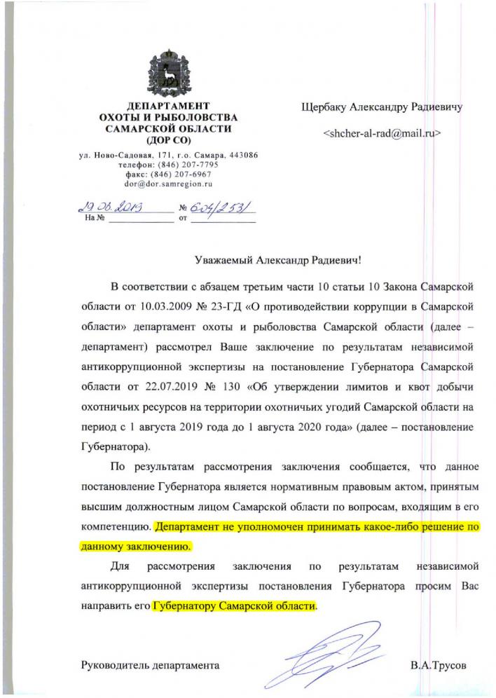 так нагло меня еще не брили![]() Самарская межрайонная природоохранная прокуратура, Заместителю прокурора, младшему советнику юстиции Теремшову Т.В. от Щербака Александра Радиевича shcher-al-rad@mail.ru +79253330949 (о совершении административных правонарушений и о восстановлении нарушенных прав) Уважаемый, Танатар Вячеславович! Я, Щербак Александр Радиевич, являюсь независимым антикоррупционным экспертом аккредитованным Минюстом России на проведение независимой антикоррупционной экспертизы нормативных правовых актов и проектов нормативных правовых актов (Свидетельство №3130 от 26.10.2018[1]). В ходе своей экспертной деятельности мною была проведена экспертиза и подготовлены заключения по результатам независимой антикоррупционной экспертизы нормативных правовых актов (далее НПА): Постановление Правительства Самарской области от 29 июля 2019 года №516 «Об установлении запрета на проведение любительской и спортивной охоты на отдельные виды охотничьих ресурсов и способы охоты на территории охотничьих угодий Самарской области» [2] (далее Заключение №1) и Постановление Губернатора Самарской области от 22 июля 2019 года №130 "Об утверждении лимитов и квот добычи охотничьих ресурсов на территории охотничьих угодий Самарской области на период с 1 августа 2019 года до 1 августа 2020 года" [3] (далее Заключение №2). Разработчиком данных НПА является Департамент охоты и рыболовства Самарской области (далее ДОиР СО), который согласно Положения о нем, утвержденное Постановлением Правительства Самарской области от 13 февраля 2008 г. N 26 «О департаменте охоты и рыболовства Самарской области» является специальным уполномоченным органом исполнительной власти Самарской области по охране, федеральному государственному надзору и регулированию использования объектов животного мира, отнесенных к охотничьим ресурсам, и среды их обитания. В полномочия и предметы ведения департамента входят разработка проектов законов и иных нормативных правовых актов Самарской области, регулирующих отношения в области охраны, использования, сохранения охотничьих ресурсов и среды их обитания, охоты, рыболовства и охраны водных биологических ресурсов. На основании абзаца второго подпункта а), пункта 7_1, части 7 Постановления Правительства РФ от 26.02.2010 «Об антикоррупционной экспертизе нормативных правовых актов и проектов нормативных правовых актов» я обратился в электронный адрес разработчика соответствующих документов (dor@dor.samregion.ru). Заключение №1 было отправлено мною, с моего электронного адреса, электронным письмом[4] 08.08.2019, а Заключение №2 электронным письмом[5] 12.08.2019. Письмами ДОиР СО от 27.08.2019 №604/2504 [6] и от 29.08.2019 №604/2531 [7] мне отказано в мотивированном ответе с отражением учета результатов независимой антикоррупционной экспертизы и (или) причины несогласия с выявленными в НПА коррупциогенными фактороми, якобы из-за отсутствия полномочий в принятии решений по заключениям, а также в нарушении п.3, Ст.8 Федерального закона от 02.05.2006 N 59-ФЗ "О порядке рассмотрения обращений граждан Российской Федерации" мои обращения не были перенаправлены по компетенции в течении семи дней со дня регистрации в Правительство и Губернатору Самарской области с уведомлением меня о переадресации обращений, а предложено самостоятельно направить мне туда свои обращения, чем нарушено мое право на полу