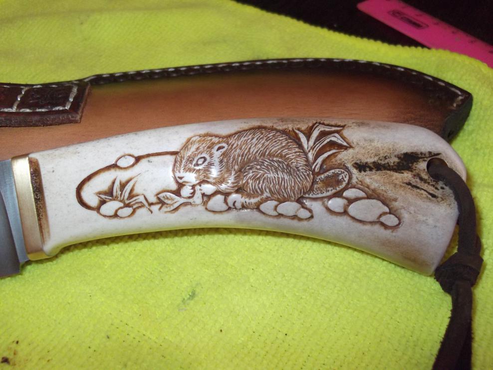 К продаже эксклюзивный нож- исключительно "РУЧНОЙ" работы,в единственном экземпляре Романа Серкова. Клинок-сталь Х12МФ (термическая обработка-закалка)приобретен в этом году на выставке, не полирован,гарда-латунь, рукоять- рог лося, изображение бобра- вырезано вручную с последующим "проявлением", ножны выполнены из кожи ("фанера"),прошиты вручную, тиснение, толщина в обухе около 3-3.5 мм. Цена - 15 000 рублей. Торг возможен....только при осмотре. звонить по тел. +7 девять 27 два 05 6118 . С уважением Сергей.