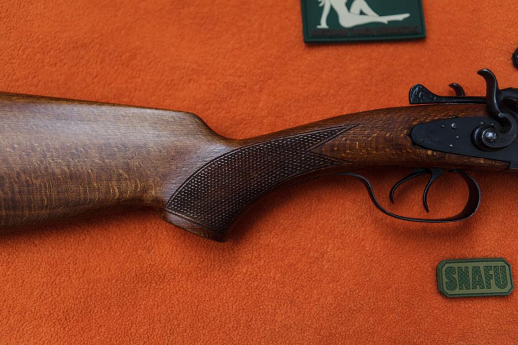 Душевное ружье. Цветную калку жалко зачернили. Дерево симпатишное, но от чего оно? Полупистолетка на современный лад. Для не посвященных вставлю 5 копеек. Правый ствол 0,5, левый 1,0. Сверловка 16,8. Вес в районе 3200. Типа Ап.