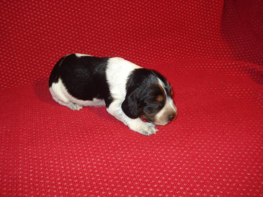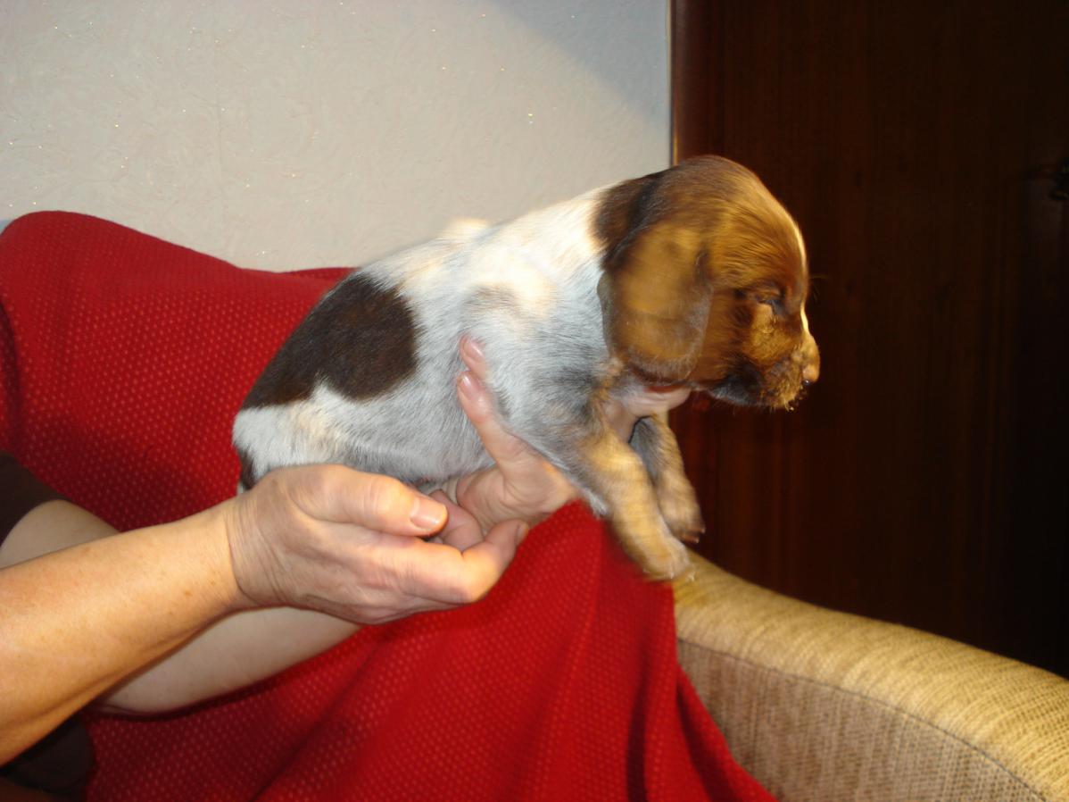 4. Кобель Черно -пегий в крапе с подпалом. Выбран.