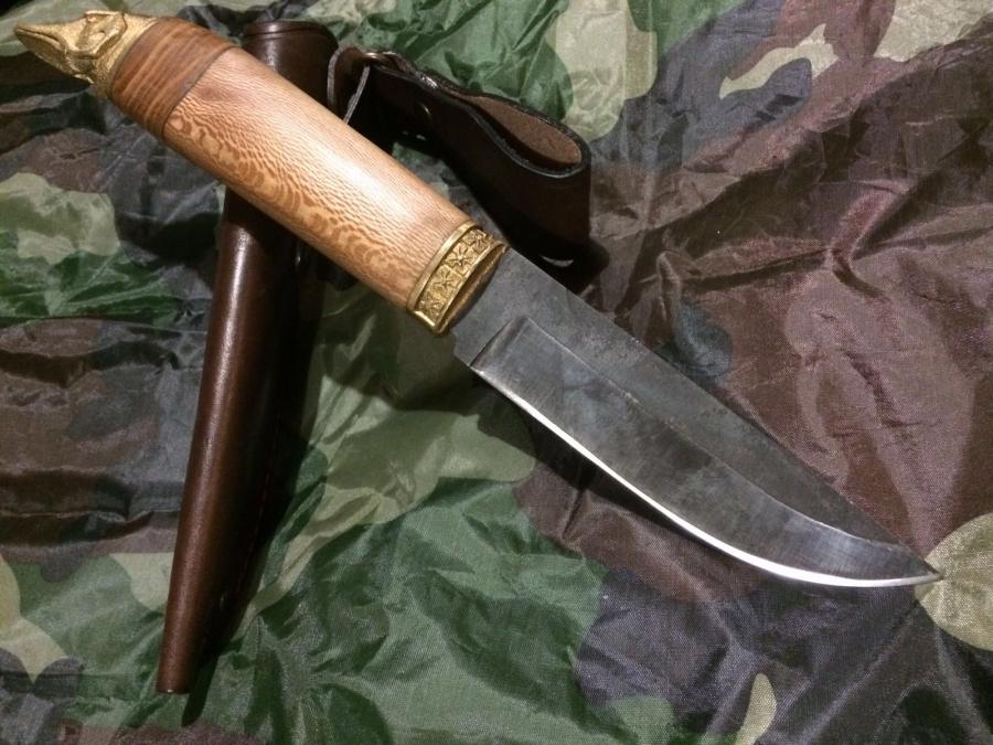 Лот 1 нож моего изготовления. Единственный экземпляр, ручная работа.клинок кованая сталь Х12МФ, клики этой партии бились честных 61Ровелл. рукоятка кавказский платан+жабры акация. литье щука латунь. Всадной монтаж. Финские ножны темно коричневого цвета, сидит в них как для него и делали. При хвате за голову щуки баланс таков что можно и потопорить. В лучших традициях девственности не точился! Вы будете первым) если кому это не важно могу заточить. Отдам за 2500.. Чудный подарок на 23. Клин 130мм, общая длина 29,5. обух 5мм!
