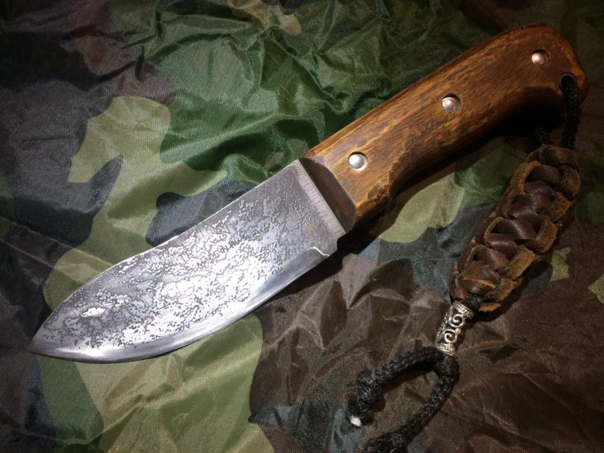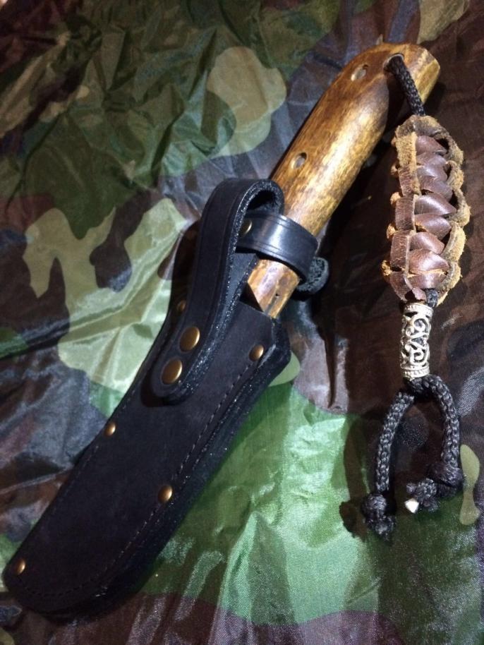 лот 2 Скинер, тоже мой нож, клинок травил химически, окно под темляк Alu, сам темляк полиамид шнур+нат кожа. ножны оч толстая кожа. покрытие рукоятки воск, скипидар, канифоль. ценник 1000