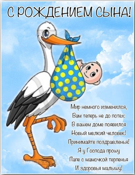 V-Zhenek, Поздравляю с рождением сына — с прибавлением! Пусть растет он здоровым, крепким, выносливым, сильным, надежным мужчиной. Пусть ваш дом будет всегда наполнен радостью, улыбками и задорным детским смехом, который всегда вас заставит улыбнутся, даже в самый пасмурный день. Здоровья малышу и Мамочке!