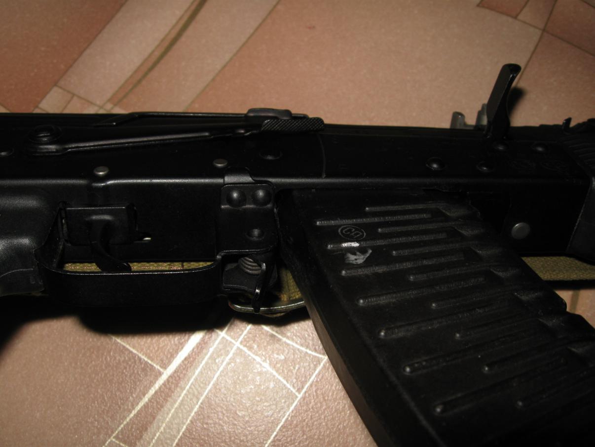 Установлена ребристая крышка от АК-74 с возвратной пружиной, переходник под магазины АК-74, прицельная планка на 1000 м, кастомный ДТК.