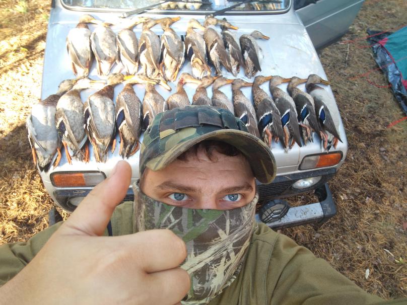 И так, суббота вечерка - полный ноль, ни одного выстрела с моей стороны. Рядом выстрелы были, но по чему и с каким результатом не видел, незнаю. Утро, воскресенье, поднимаемся с сыном раньше будильника, либо не шибко удобно спать в машине, либо в предвкушении утрянки. Чай на скорую с бутерами и вперед. По дороге на место охоты, думаю надо зарядиться, а то как обычно, пока идешь... И тут из-за деревца пятерка кряковых и пара промахов с моей стороны. Было еще несколько офигенных моментов, но почему то сегодня очень мазал. Потом шел одиночный чирок сбоку, выстрел... он от нас... еще выстрел... он развора чивается на нас и деру, и тут плавно начал снижаться на землю, я успел зарядить один патрон, подбегаем, а он уже отошел в мир иной.