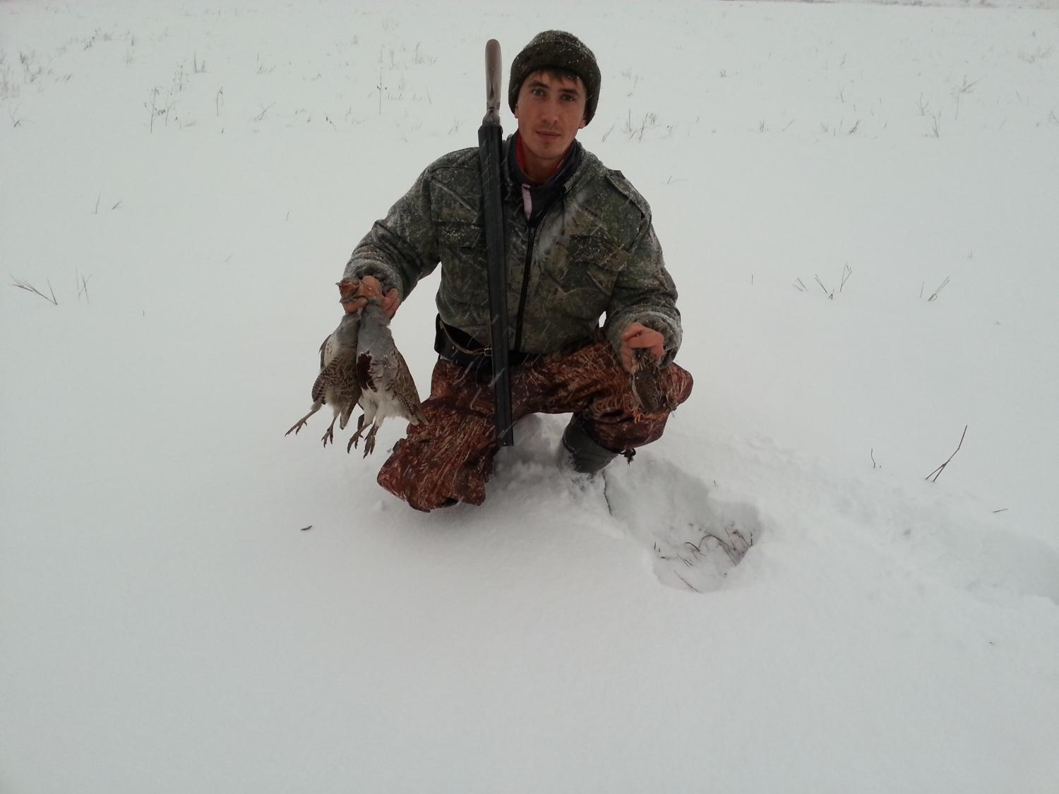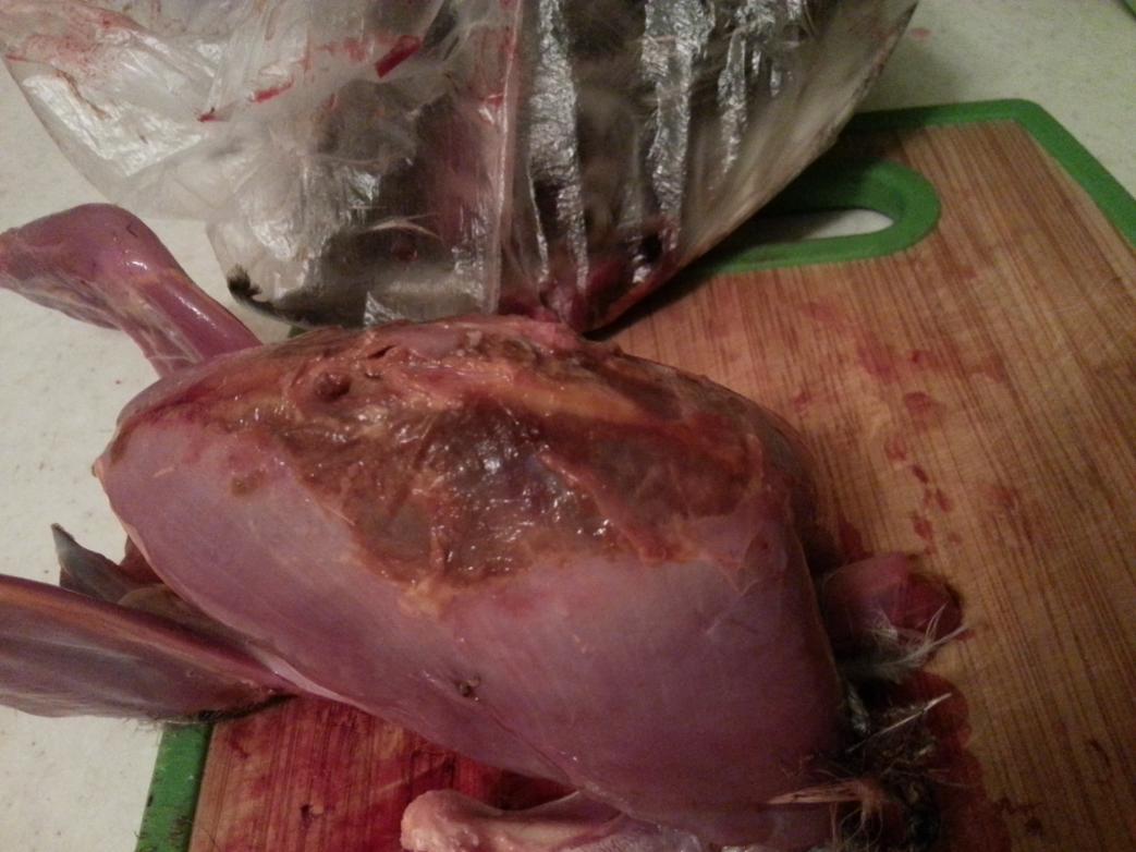 Сегодня была попытка поохотится на зайца, но он судя по всему не вставал. Прошли не мало км, но ни единого следа. Да и снег валил весь день не прекращаясь. Зато подняли перепела, и пару стаек куропаток. В итоге у меня перепел и две куропатки, у брата одна куропатка. Дома решил не щипать, а шкурки поснимать, у одной из куриц было на грудке коричневое пятно, порезал ножом в этом месте, мясо внутри такого же цвета и рыхлое... пришлось выкинуть.