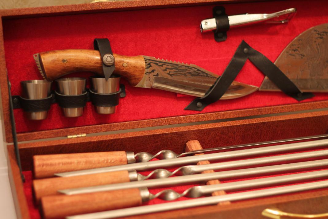 Набор охотника (туриста). Комплектация: 1) нож туристический — 1 шт., 2) чехол для ножа — 1 шт., 3) топор — 1 шт., 4) шампур — 6 шт., 5) штопор — 1 шт., 6) стакан маленький — 6 шт., 7) коробка кожезаменитель — 1 шт. Отдам за 4500 руб.