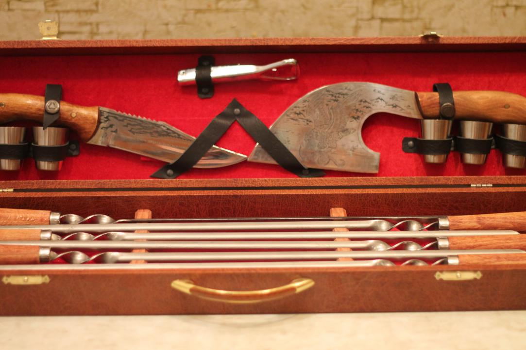 Набор охотника (туриста). Комплектация: 1) нож туристический — 1 шт., 2) чехол для ножа — 1 шт., 3) топор — 1 шт., 4) шампур — 6 шт., 5) штопор — 1 шт., 6) стакан маленький — 6 шт., 7) коробка кожезаменитель — 1 шт. Отдам за 4500 руб.