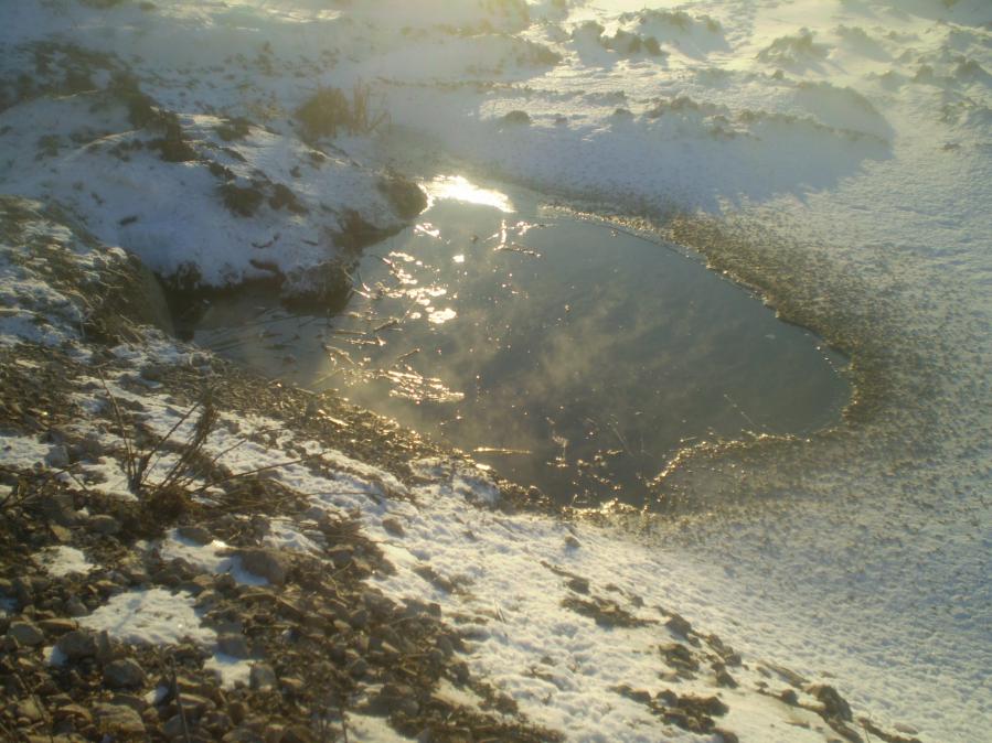 В наш прошлый выезд, Сергей с Васей нашли парочку лужиц с незамерзшей водой. Мне давно говорили охотники за дроздами, что нужно искать место водопоя. Вот в одно солнечное утро, я и решил проверить, не пьют-ли из этих лужиц дрозды. Заодно и найти где они, эти самые лужицы были обнаружены.