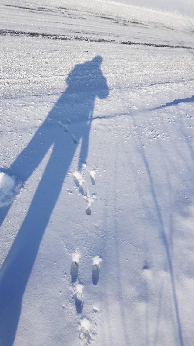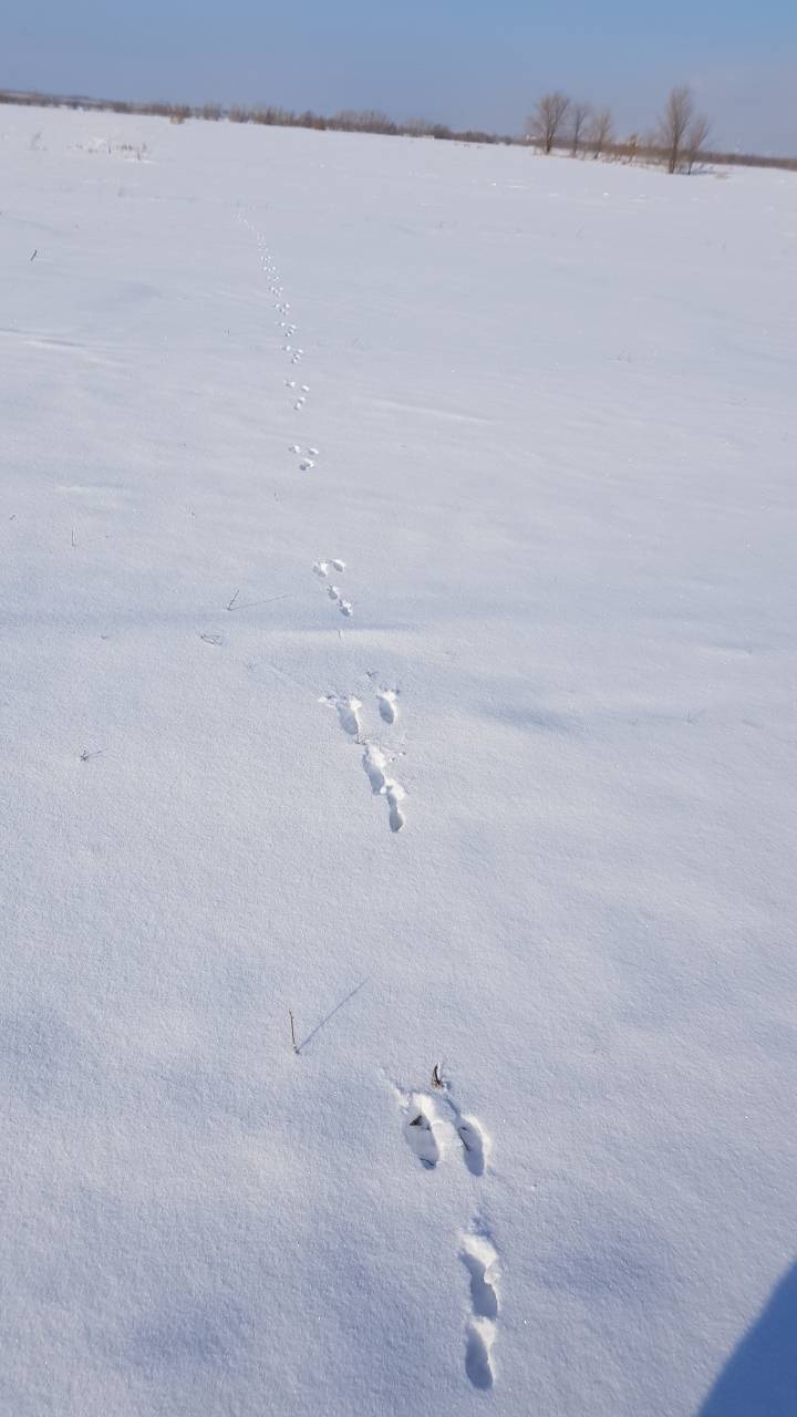 Заяц в поле есть, следы все свежие, хорошо читаемые. Первого поднял минут через 30, но поднялся очень далеко, посмотрел на меня и в сторону аккуратненько поскакал, решил пойти за ним, не спеша. Нашел 2 его лежки, все были в чистом поле на поверхности, на первой были следы сороки, сделал предположение, что она его и подняла, со второй я его поднял. Прогнал он меня километров 10 ни разу не лег. По дороге еще и кушать успевал, в итоге так и ушел в дачи. Поняв, что больше не ляжет, пошел искать другой выходной след. По дороге встретил деда, годков за 70!!!! Поговорили, так он на общественном транспорте, с лыжами за город, а дальше на своих двоих в поле. Пошли с ним параллельным курсом, в итоге он пошел дальше, а я меня уже силы были на исходе. Решил возвращаться к машине.