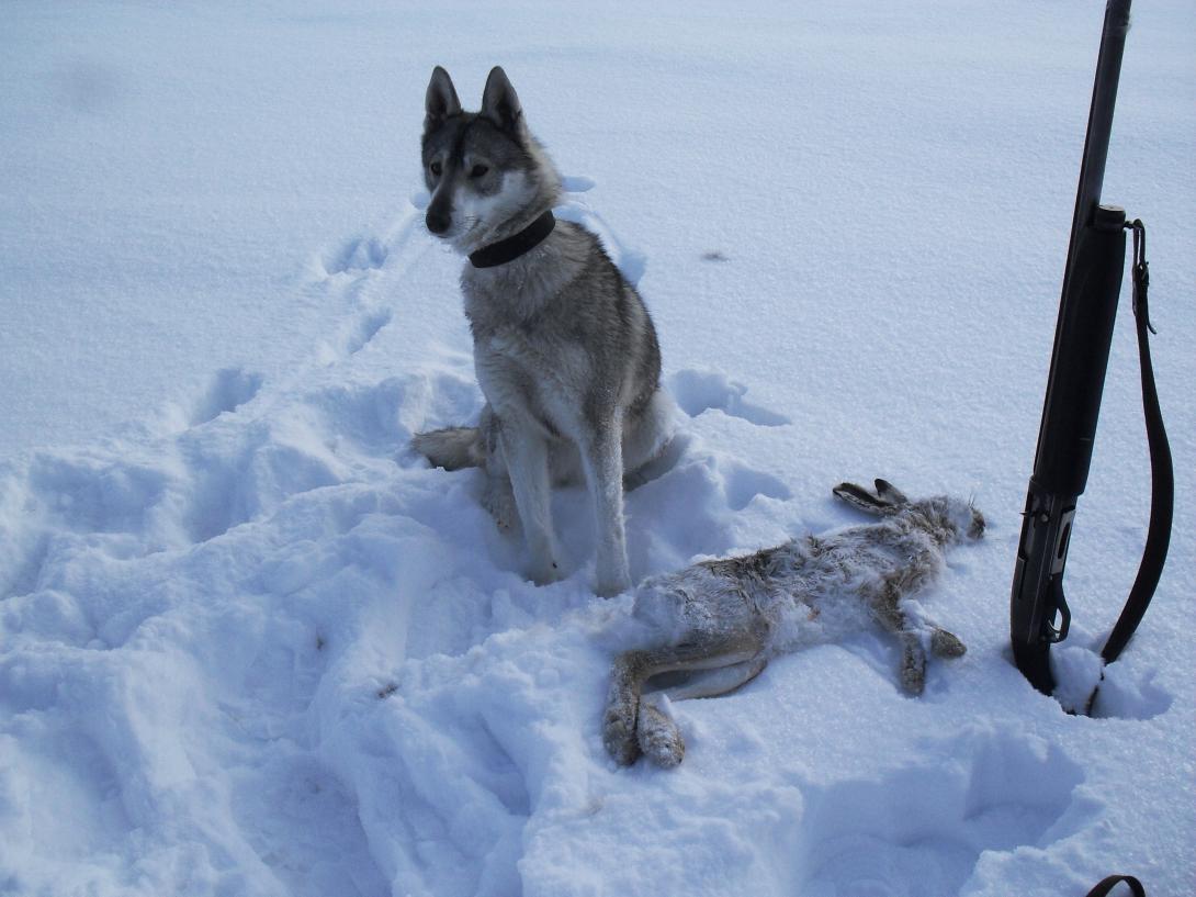 Переехали ближе к речке, на край села. Пробежались быстренько, время поджимало. Следы вели на зады строящихся домой. Выжлец зашел в колок деревьев, стою, жду, сморю бежит ушастый по бровке посадки. Вскидываюсь, зай сел, выстрел, зай срывается в посадку. Как? Не пойму. 30 метров было, не дальше. На месте пух, крови на следу нет. Провожаю выжлеца по следу. Через пару минут гон стих. Мысль не покидает меня: может дошел?!