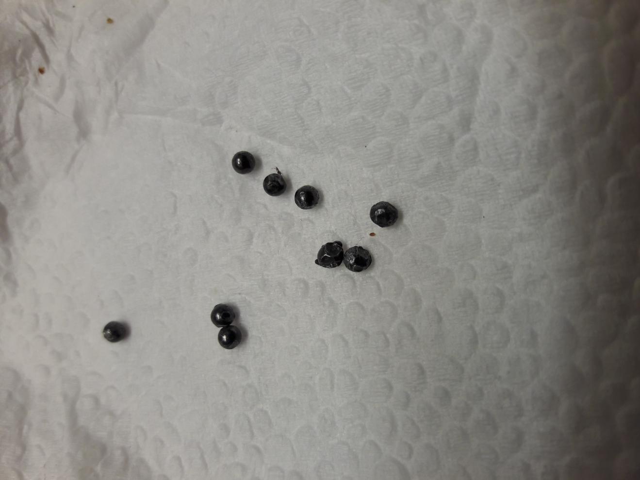 Ловчий встретил приветливо, не смотря на ужасающее количество спортсмЭнов разных мастей: стендовики, пистолетчики и прочие практики. Но я то теоретик - они мне не помеха. А как я стрелял... А как я стрелял??? Стрелял так, что самому приятно было.... И даже после удачного дуплета срывал аплодисменты подвыпившей компании ( и тут меня нашли). Вернулся с "охоты" довольный как Цезарь после Клеопатры. А дома уже ждала дичь.. самая настоящая, еще с осени (жена морозилку прибрала). Чирочки и кряквы в медово-горчичном маринаде фаршированые зеленым яблочком. Я в Кулинарии это упоминал. Сначала захомячил чирочка (первого сразу моя скво дернула - она знает толк в фкусных уточках), а потом принялся за кряка. Вот не помню, к сожалению, историю его добычи, но... при поедании извлек 16!!! дробин №7,5. Спортинг рулит! Часть дроби на фото. Фото дичи не выкладываю из этических соображений.