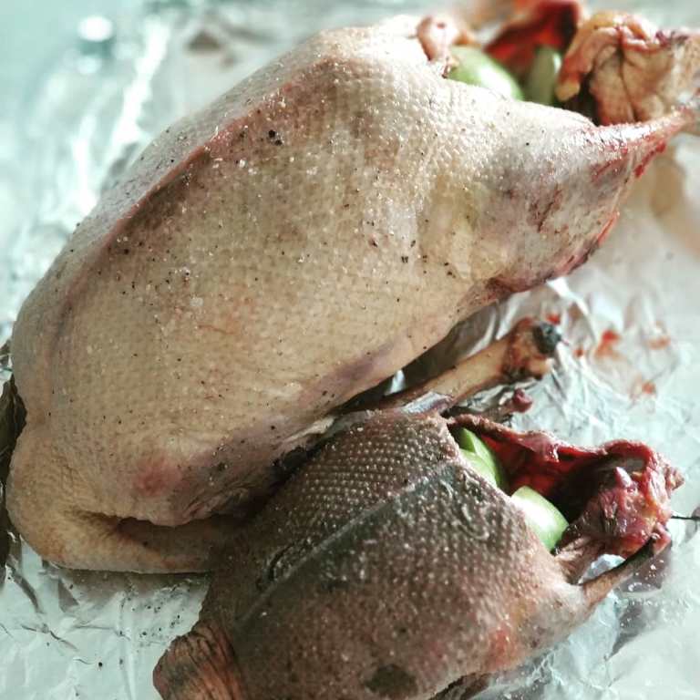 Один из гусей при добыче сильно "пострадал", пришлось снимать и шкуру и разделать его на куски. Попутно с трех гусей и одного селезня добавил потрошки (их отварил предварительно 20 мин.). Далее все это обжарил с луком и уложил в глиняный горшок еще на 1 час в духовку, специи только соль и перец, сухое вино белое. Далее можно добавить к любому гарниру, ум отъешь! Я так ем!)))