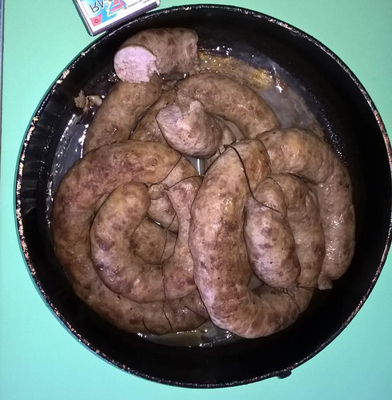 Здорово выглядит,а раз так значит и вкус на высоте.Мы тоже иногда такими вещами балуемся,когда кишки есть.Всё то же самое,но есть там кроме свинины и мясо перепелов,коростелей,вальдшнепов ну и что ещё из дичи есть в данный момент под руками.Дичины немного,но она там есть.Правда жарим колбасу не на мангале.