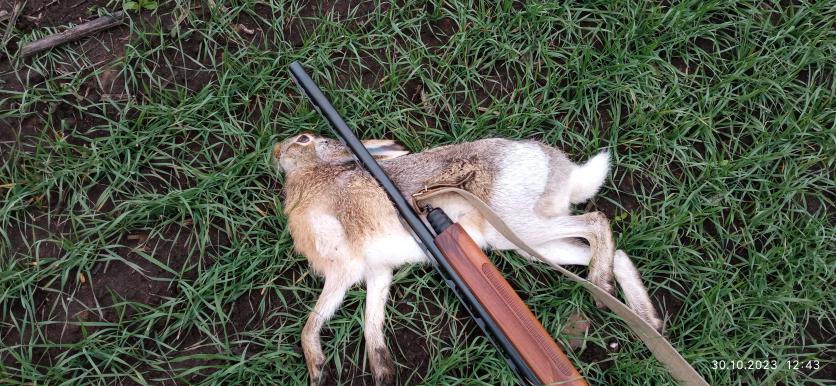 Осеннюю охоту люблю, потому что понимаю, где искать в это время года зайца. Главное- хорошо изучить охотугодья, где охотишься. Где зимой видел зайца, там и осенью он будет. Каждый год, у меня, это подтверждается. Первого зайца добыл 29.09.23. Участок местности имел много небольших и не глубоких ям: как будто после бомбежки, с травой и травяными кустами. В одной он и лежал под таким кустом. Выскочил метрах в 10 и прикрываясь за травой понесся вперед, но потом резко уменьшил пыл. и побежал медленнее, подпрыгивая, как косуля Стрелял в угон "3" БК. Попал первым в голову.Вес 3700.